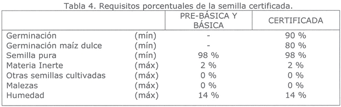 7.1. Los requisitos porcentuales, que deben cumplir los lotes de semilla certificada de maíz para las diferentes categorías, son los indicados en la Tabla Nº4, definiéndose el tamaño de lote en la norma general: