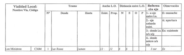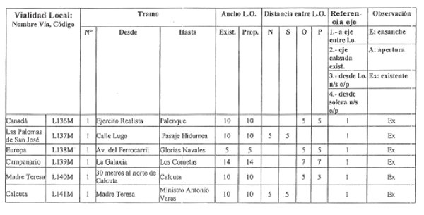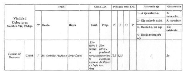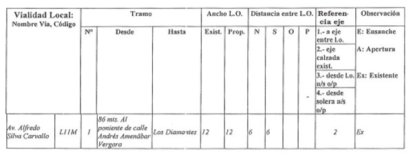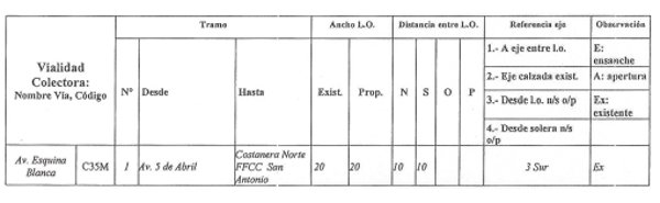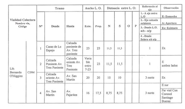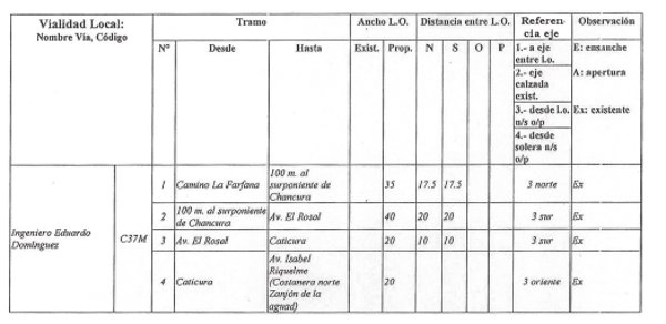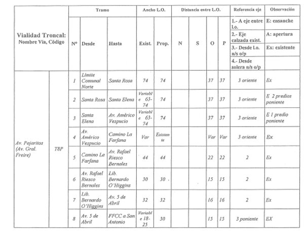 1.1. Modifíquense del actual Capítulo V "Vialidad", Artículo 51º, las columnas de observación, distancia entre líneas oficiales, códigos y tramos como a continuación se indica: