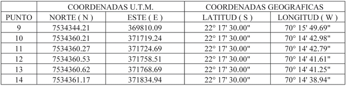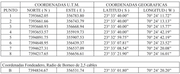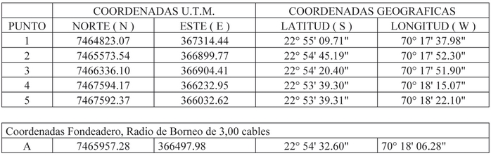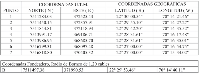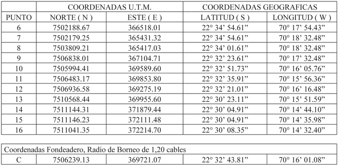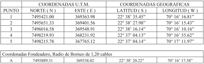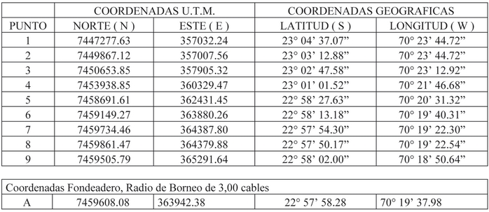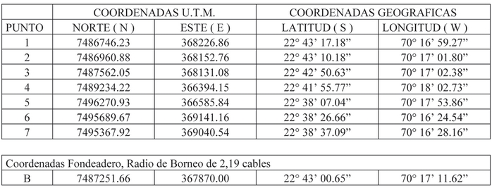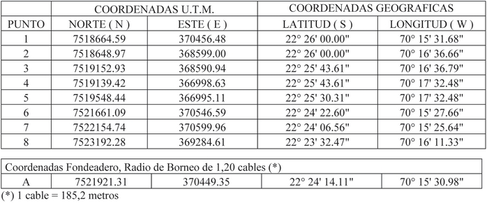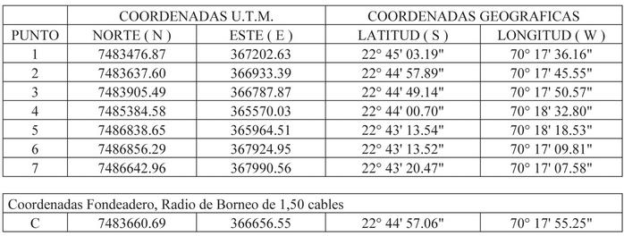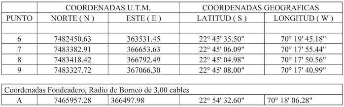 . Corresponde a la primera milla náutica fijada entre las latitudes 22º 28' 00" S. y 22º 16' 30" S., que se encontraba graficada en la Carta SHOA Nº 1000, escala 1:500.000, 10ª edición 1994, conforme a establecido en la la letra b), del DS (M) Nº 460 de 2002.