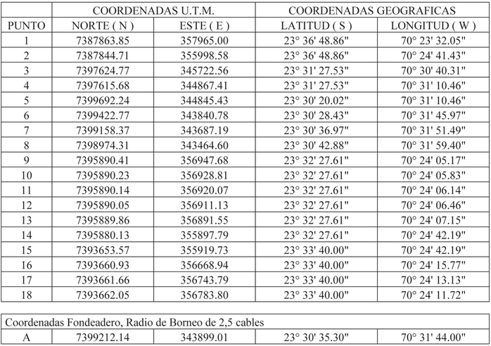 . El traspaso de este sector fue realizado sólo hasta la latitud 23º 36' 48.86" (latitud reposicionada), en concordancia con la primera milla náutica fijada como A.A.A. entre las latitudes 22º 27' 00" S y 23º 36' 36" S, graficada en la Carta SHOA Nº 2000, escala 1:500.000, 3ª edición 1979, según lo establecido en la letra b), del DS (M) Nº 460 de 2002.