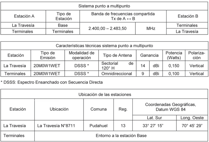 1. Autorízase a la concesionaria para instalar, operar y explotar un (1) sistema punto a multipunto en la banda de 2,4 GHz, cuyas características se indican a continuación: