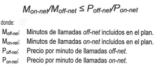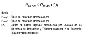 1. El precio por minuto de llamadas a teléfonos móviles de otras compañías ("llamadas off-net") no podrá ser superior a la suma del precio por minuto de llamadas a teléfonos móviles de la misma compañía ("llamadas on-net") del mismo plan y el cargo de acceso aplicable, según la fórmula que se indica a continuación*: