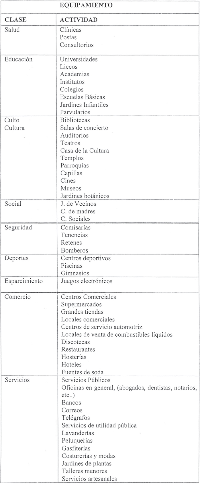 El equipamiento permitido en la Circunvalación Vial será de las siguientes clases y actividades, según los tramos que a continuación se indican: