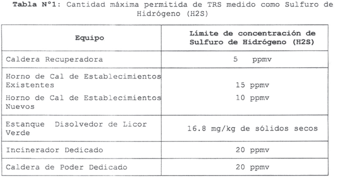 Artículo 3°.- Límites máximos de emisión: Los límites máximos de emisión de TRS, permitidos en el efluente de cada equipo, serán los señalados en la siguiente tabla:
