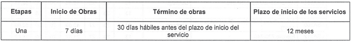 La implementación del proyecto se realizará en una etapa y los plazos para el inicio y el término de las obras, así como para el inicio del servicio, serán los que se indican a continuación: