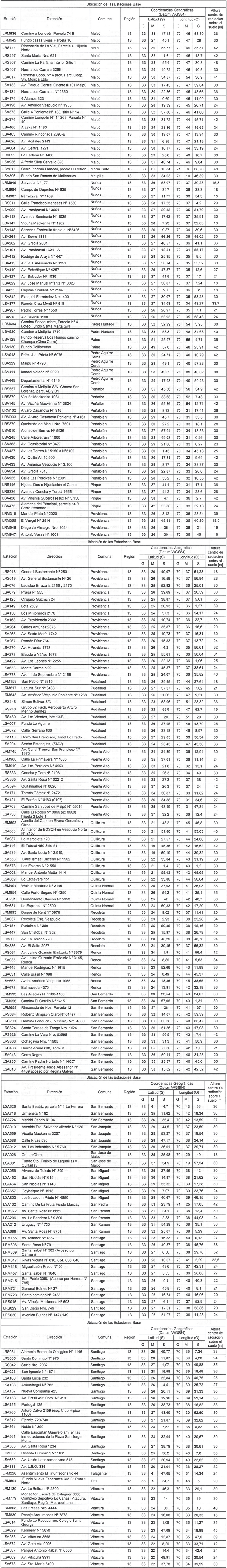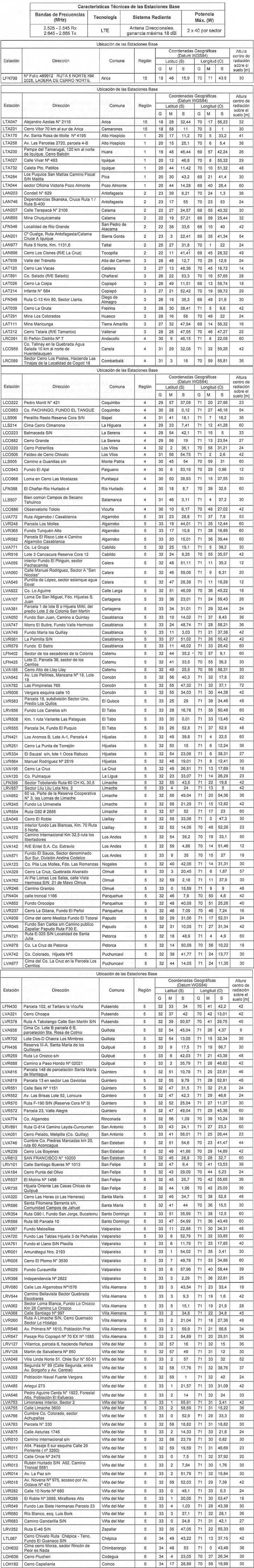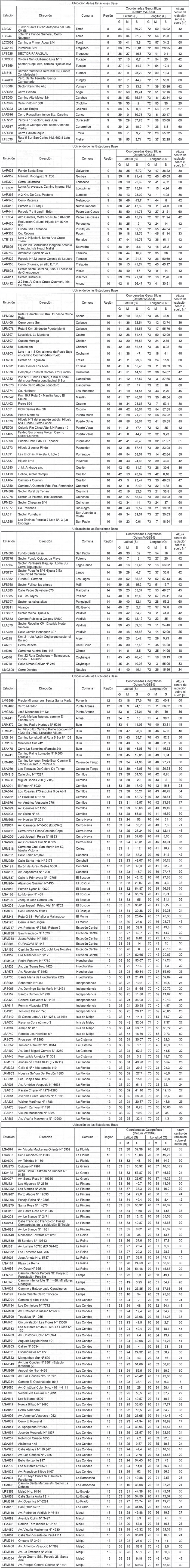 Las características técnicas de las estaciones base y sus respectivas ubicaciones se indican a continuación: