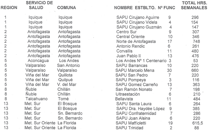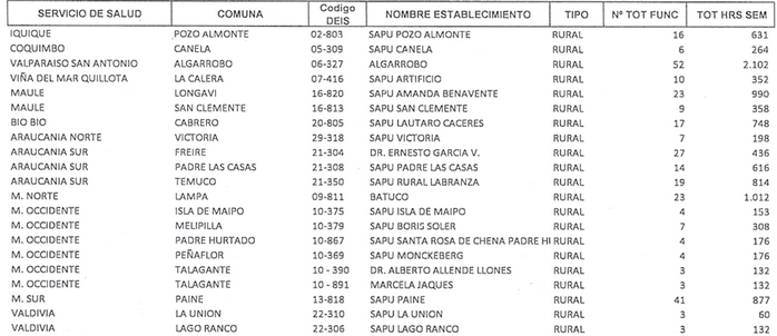 . 2º. Concédese una asignación de desempeño difícil de 15% al personal que labora en los Servicios de Atención Primaria de Urgencia Rural que se señalan, en las comunas que se indican, el que alcanza a 10.667 hrs. sem. que corresponden al 0,50% de la dotación de horas semanales totales del país: 2.150.456,70 hrs.
