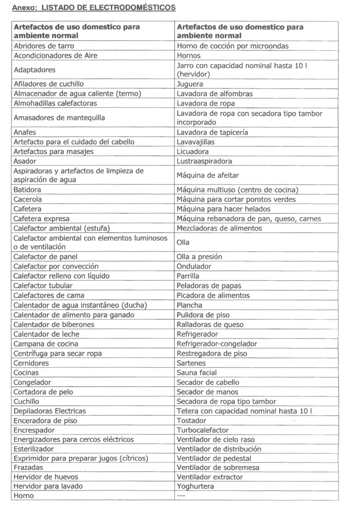 1. En relación a los productos electrodomésticos, tales como: artefactos para el cuidado del cabello, artefactos para masajes, aspiradora, artefactos de limpieza, batidora, calefactores, calientacama, calentadores de agua y alimentos, cocinas, congelador, enceradora de piso, frazadas, horno, horno microondas, juguera, lavadora, licuadora, ondulador, plancha, refrigerador, secador de cabellos, tostador, ventilador y aquellos indicados en el Anexo que se adjunta.
