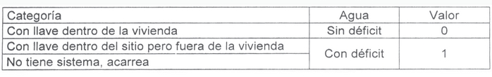 Agua: Corresponde a la variable disponibilidad de agua de la Ficha de Protección Social o el instrumento que la reemplace, de la cual forma parte el núcleo familiar del postulante, según la siguiente clasificación: