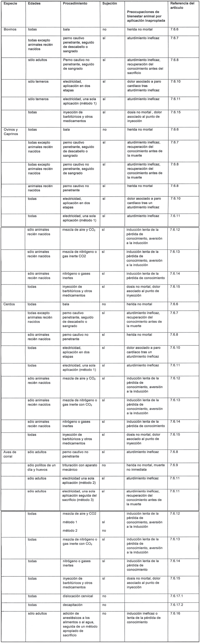 Métodos de matanza descritos en los artículos 7.6.6 a 7.6.18