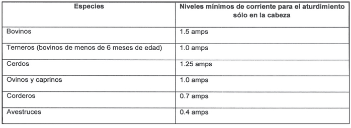 Artículo 21.- El equipo utilizado para la insensibilización con método eléctrico sólo en la cabeza, deberá alcanzar los niveles mínimos de corriente señalados en el Capítulo 7.5., artículo 7.5.7.3 del Código Sanitario de los Animales Terrestres de la Organización Mundial de Sanidad Animal (OIE) que se detallan a continuación: