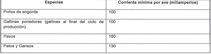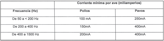 La corriente mínima para el aturdimiento de las aves de corral cuando se utilicen altas frecuencias será la siguiente: