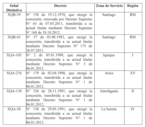 a) La solicitud de autorización previa para transferir las concesiones de Radiodifusión Sonora en frecuencia modulada, señales distintivas XQB-39 (100,9 MHz), XQB-43 (105,7 MHz), XQA-105 (106,1 MHz), XQA-276 (105,7 MHz), XQA-138 (105,7 MHz) y XQA-38 (88,9 MHz); otorgadas mediante decretos supremos indicados en la letra f) de los Vistos, ingreso Subtel Nº 88.986 de 13.11.2012, complementada mediante ingreso Subtel Nº 98.077 de 14.12.2012;