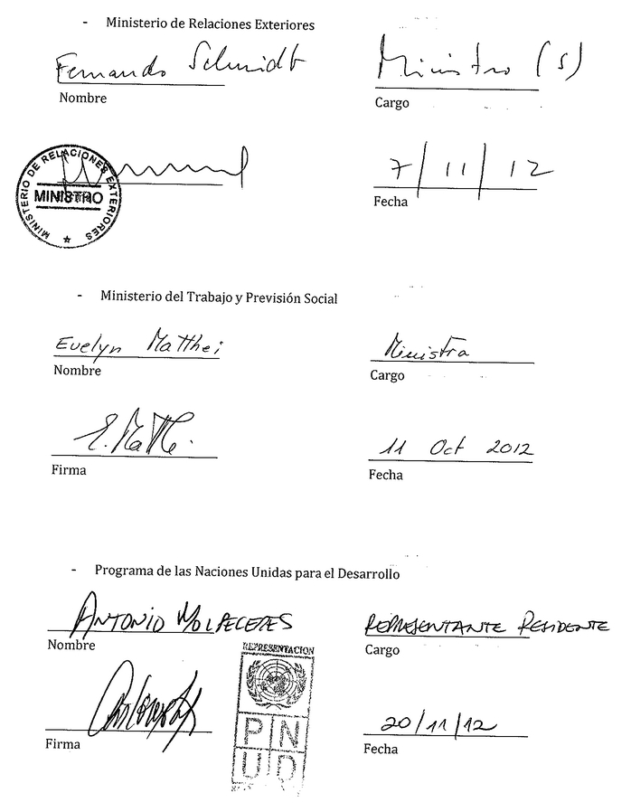 Que con fechas 7 y 20 de noviembre de 2012, se suscribió, en Santiago, entre el Gobierno de la República de Chile y el Programa de las Naciones Unidas para el Desarrollo el Acuerdo sobre el Proyecto: "Programa de Políticas Públicas de Empleo y de Capacitación".