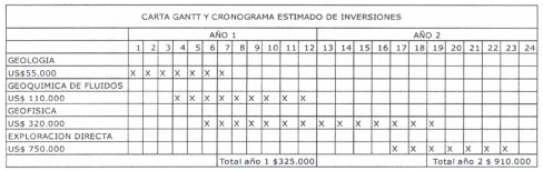 De acuerdo al proyecto presentado por la empresa, el total de la inversión comprometida para los dos años de concesión asciende a US$1.235.000.- (un millón doscientos treinta y cinco mil dólares de los Estados Unidos de Norteamérica) considerando los montos de inversión para cada una de las actividades y tiempos de realización que se indican a continuación:
