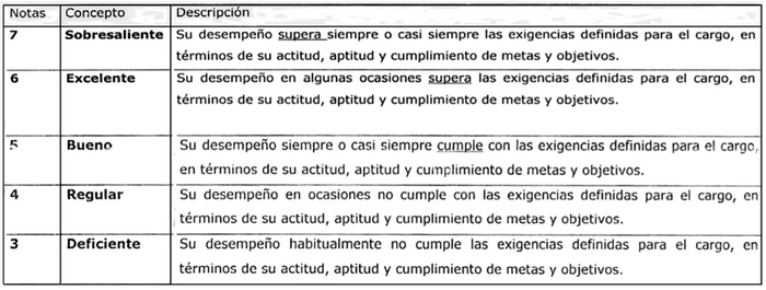 Artículo 4º.- Notas. El proceso de calificación evaluará los factores y subfactores señalados en el artículo anterior, por medio de notas que tendrán los siguientes valores y conceptos: