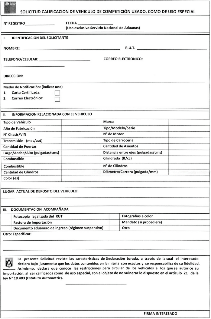 El interesado deberá solicitar ante el Subdepartamento de Normas Especiales de la Dirección Nacional de Aduanas, mediante el formulario "Solicitud Calificación de Vehículo de Uso Especial", que se adjunta, la autorización para importar un vehículo usado de competición como de uso especial, no destinado al transporte, para los efectos de la aplicación del inciso segundo del artículo 21 de la ley Nº 18.483.
