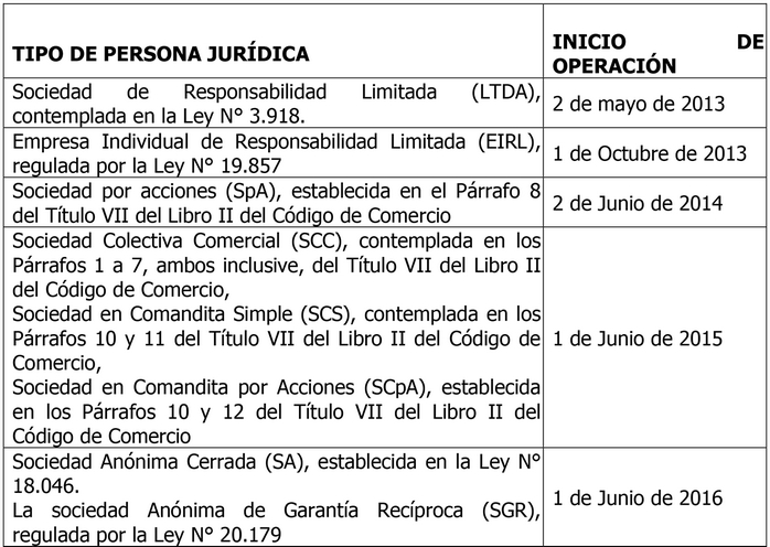 1.- Que, la Ley Nº 20.659, que Simplifica el Régimen de Constitución, Modificación y Disolución de las Sociedades Comerciales, tiene por objetivo principal facultar a las personas jurídicas enumeradas en su artículo 2, ser constituidas, modificadas, transformadas, fusionadas, divididas, terminadas o disueltas, cumpliendo las solemnidades establecidas en dicha ley y su reglamento.
