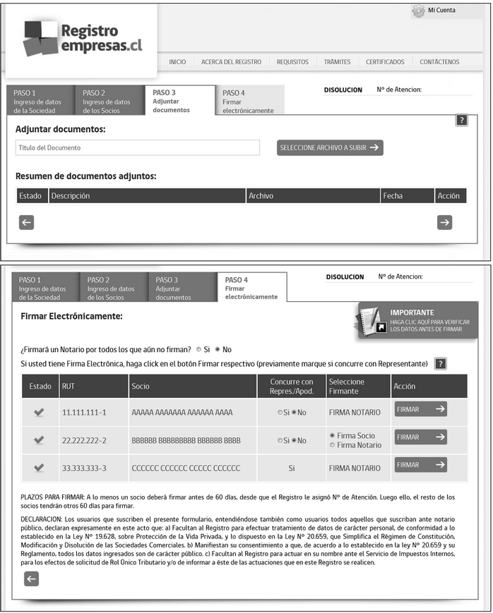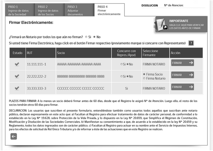 Una vez que el sistema haya asignado un Número de Atención a la actuación en trámite, a lo menos uno de los titulares, directamente o a través de Notario, deberá firmar antes de 60 días, bajo apercibimiento de eliminarse del sistema.