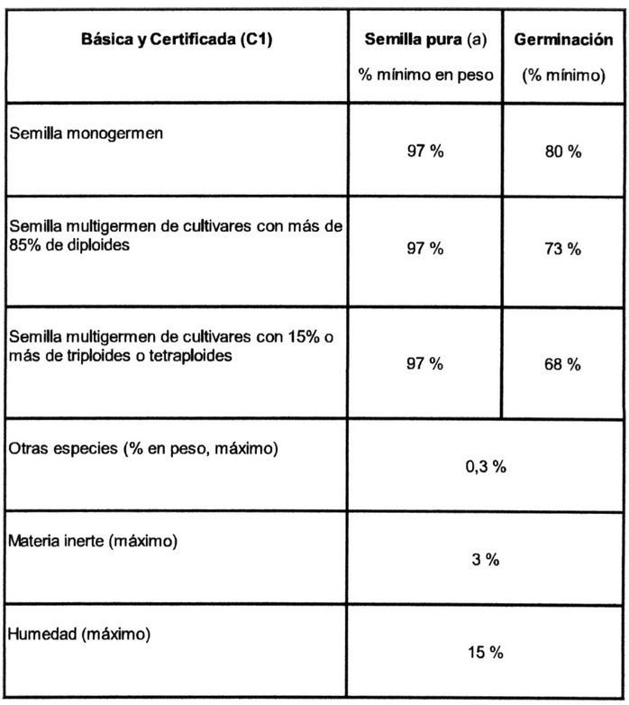 10.4 Los requisitos que deben cumplir los lotes de semilla certificada de Remolacha azucarera (Beta vulgaris L.) para las categorías básicas y certificada, son los indicados a continuación: