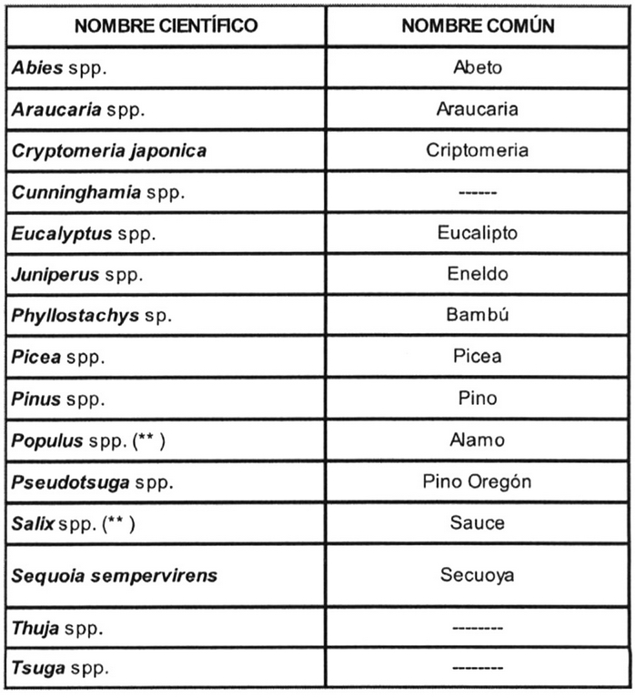 (**) Para Populus spp. y Salix spp. sólo se autoriza el ingreso de estacas sin enraizar.
