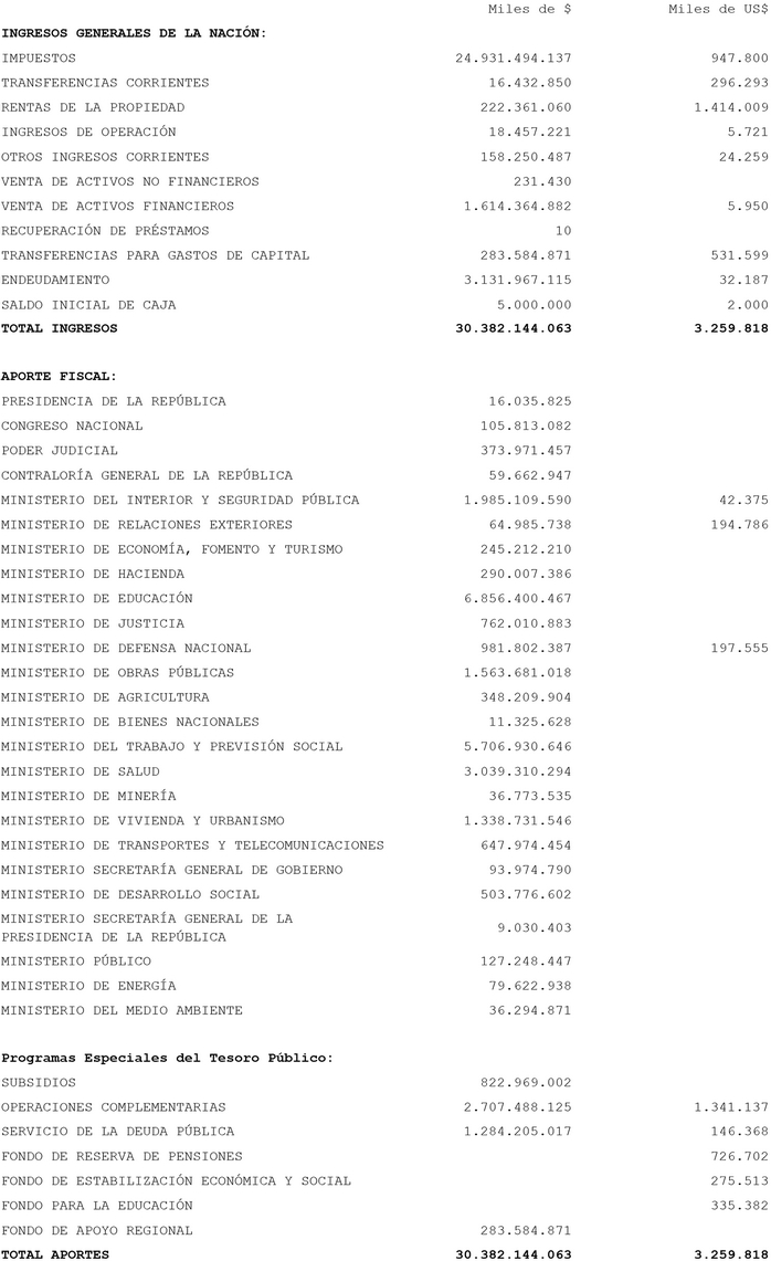 . Artículo 2º.- Apruébanse los ingresos generales de la Nación y los Aportes Fiscales en moneda nacional y en moneda extranjera, convertida a dólares, para el año 2014, a las Partidas que se indican: