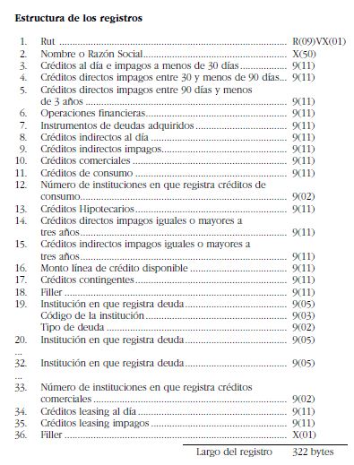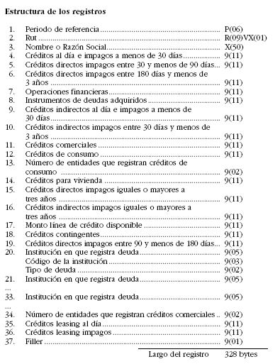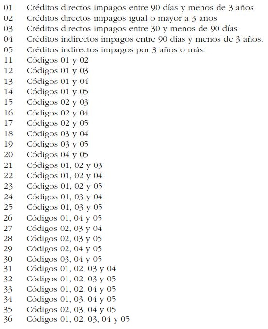 Se informa primero el código numérico de la institución (tres dígitos) y luego dos dígitos que indican el tipo de deuda según la tabla siguiente: