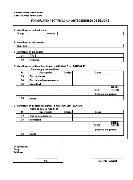 Las rectificaciones a los datos correspondientes a un deudor serán informadas a esta Superintendencia mediante el "Formulario rectificación antecedentes de deudas" cuyo formato se adjunta.