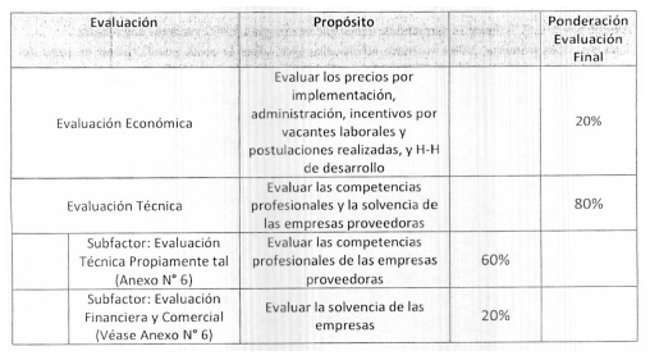La Comisión Evaluadora propondrá como adjudicatario, al oferente que obtenga la mejor evaluación final, considerando los diferentes ítems que contempla la evaluación y que se encuentran detallados en el numeral 11 de las bases técnicas de la presente licitación.