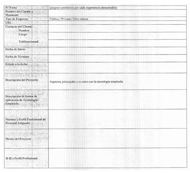 > Ficha experiencia empresa (anexo 4), de la Empresa referido exclusivamente a la ejecución de proyectos de similar envergadura, especificando claramente la fecha y duración de los proyectos abordados, además de datos de contacto para solicitar referencias y/o certificados de referencias, de empresas en las cuales haya o esté prestando sus servicios.