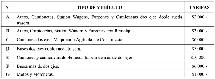 2º Fíjanse las tarifas de peaje para cualquier horario y para todos los días de la semana, incluidos sábados, domingos y festivos, de acuerdo al siguiente detalle: