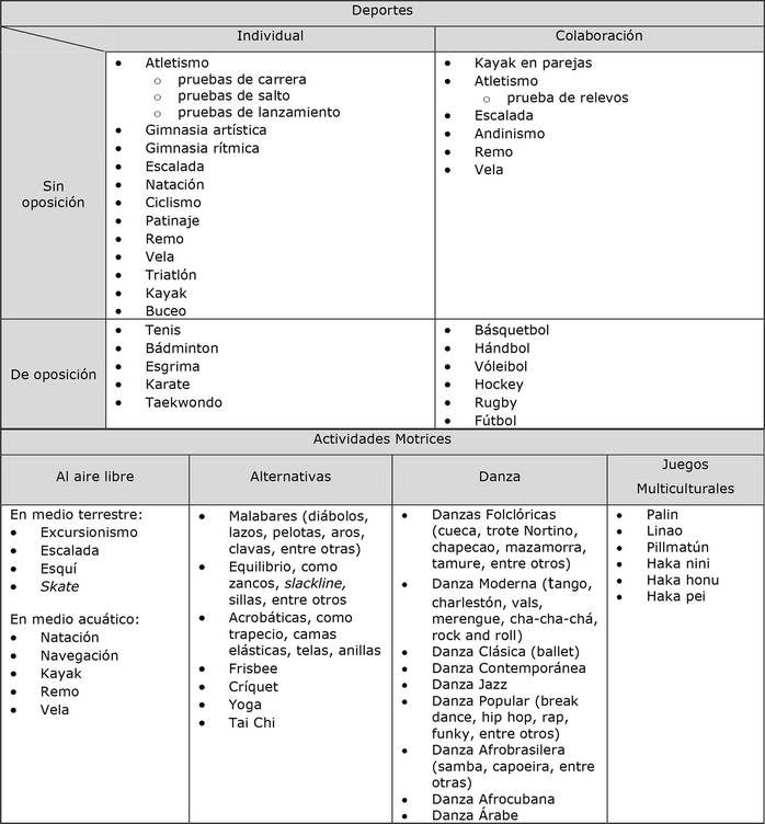 A modo de referencia, se presenta una tabla que entrega variadas alternativas de actividades físicas, motrices y deportivas para alcanzar los Objetivos de Aprendizaje. Sin embargo, se debe considerar que existen, además, otros deportes y actividades físicas que permiten desarrollar los mismos objetivos. La selección dependerá de las condiciones geográf