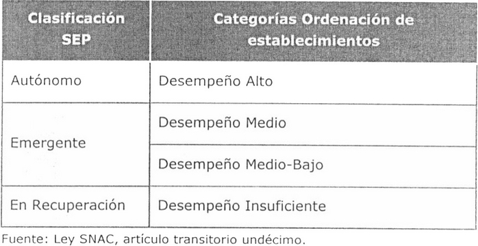De acuerdo con la ley SNAC, los establecimientos que sean evaluados en la categoría Desempeño Insuficiente deberán recibir apoyo técnico pedagógico hasta que abandonen dicha categoría o por un plazo máximo de cuatro años. Si después de ese período un establecimiento permanece en la categoría Desempeño Insuficiente, pero muestra una mejora significativa en sus resultados educativos, deberá continuar recibiendo un año adicional de apoyo, y por lo tanto, tendrá que ser ordenado nuevamente al año siguiente (ley SNAC, art. 29).