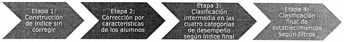 En esta primera etapa, se procede a construir un índice que agrupa todos los indicadores de resultados educativos que considera la metodología, a saber: Resultados SIMCE y Estándares de Aprendizaje, Medidas de Progreso y Otros Indicadores de Calidad Educativa.