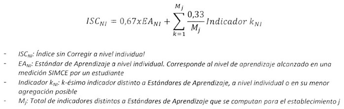 El Índice sin Corregir a Nivel Individual se construye utilizando todos los indicadores con el menor nivel de agregación posible. Este índice se define en la ecuación Nº 14. El menor nivel de agregación es el de un estudiante "a", en una prueba "p", en el período "t", en el grado "g", en el nivel de enseñanza "n" que está siendo ordenado para el establecimiento "e". Si bien no todos los indicadores se pueden desagregar a nivel de estudiante, se utilizarán en el menor nivel de agregación que cada uno pueda tener.