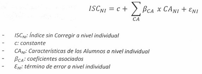 La influencia de las Características de los Alumnos en los resultados educativos se estima mediante la técnica de regresión lineal multivariada (Mínimos Cuadrados Ordinarios, en adelante MCO) según datos individuales. Posteriormente, se utilizan los coeficientes estimados para corregir los resultados de los estudiantes y calcular un índice para el establecimiento.