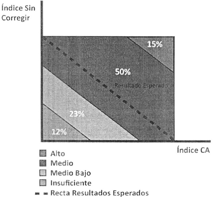 En la figura Nº 2 se representan gráficamente las categorías conformadas a partir de estos límites. En el eje y de este gráfico se presenta el Índice sin Corregir, y en el eje x se encuentra el Índice de Características de los Alumnos (CA), que corresponde a una medida de la dificultad que presenta el contexto de enseñanza al establecimiento educacional. El índice CA se define como la suma del producto entre el valor promedio del establecimiento para cada una de las variables de Características de los Alumnos y el coeficiente de la regresión asociado a cada una de ellas, multiplicada por -1.