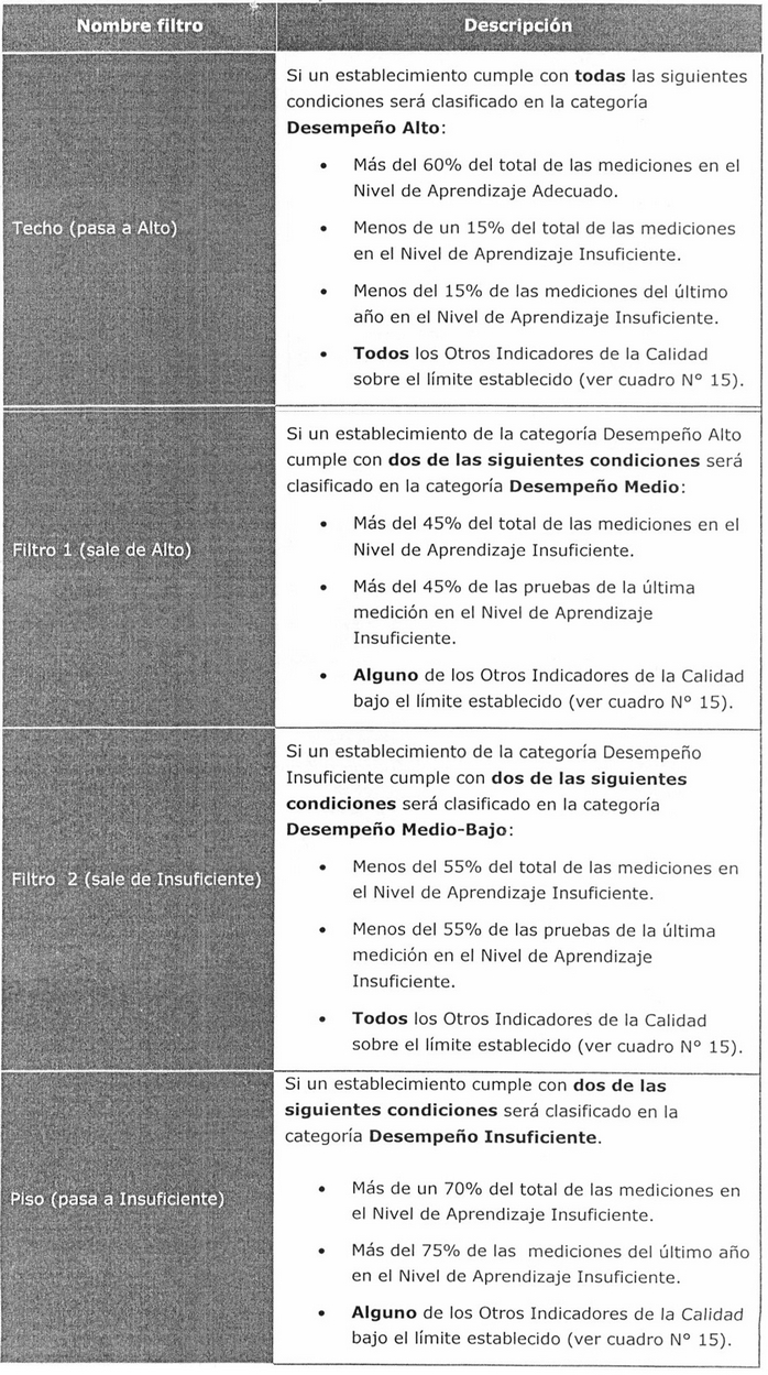 En la medida que un establecimiento cumpla con las condiciones estipuladas en el cuadro Nº 14, su clasificación final estará determinada por el filtro, independiente de su clasificación intermedia elaborada en base al Índice Final.