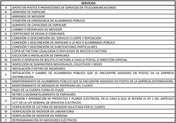 El servicio no incluye el medidor o equipo de medida ni transformadores de corriente o tensión. Para el caso de empalmes subterráneos, no se incluyen los costos de rotura de pavimento ni de excavación de zanjas, previo a la instalación del empalme. También se excluyen del servicio el retiro del empalme, el costo de derechos municipales, derechos de vialidad, cruces y paralelismos con ferrocarriles y otros derechos, así como la reposición de pavimentos.