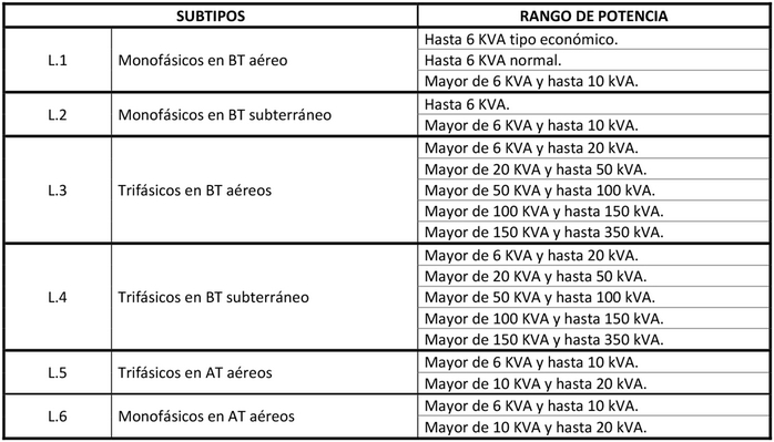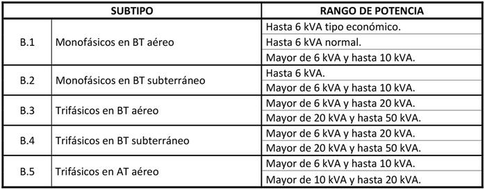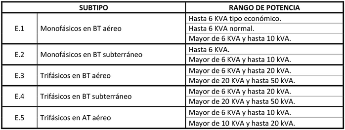 Estarán sujetos a fijación de precios los siguientes subtipos y rangos de potencia: