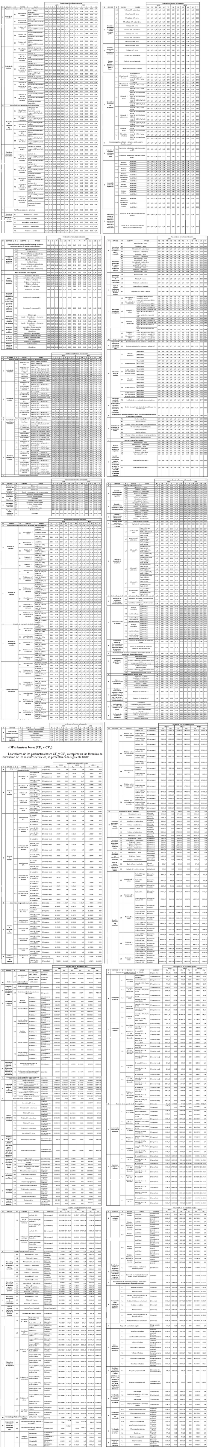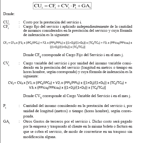 A continuación se presentan las fórmulas de precios unitarios de los distintos servicios sujetos a fijación de precios. Básicamente corresponden a la suma de los siguientes cargos aplicables al servicio según subtipo y rango respectivo: