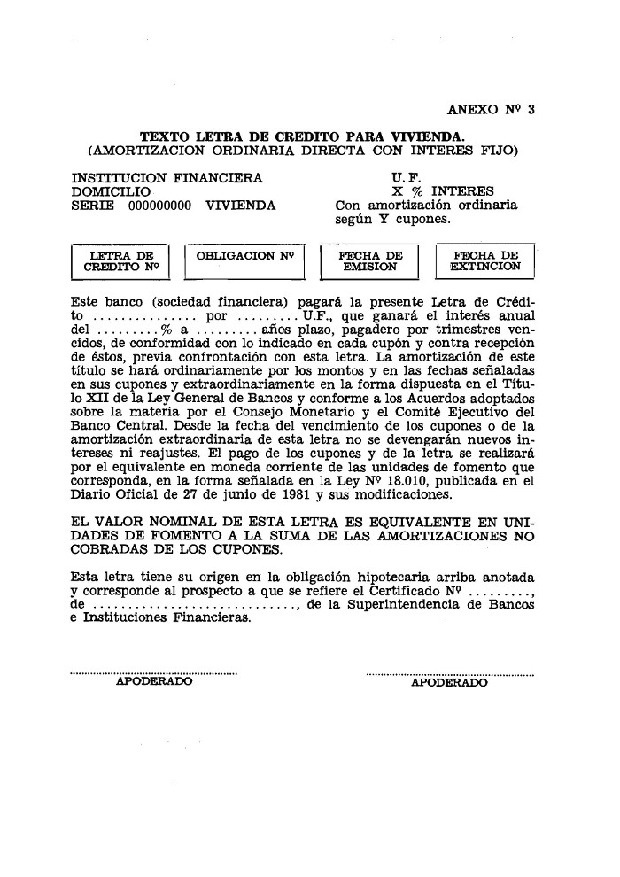 El Banco .........................................................a fin de enterar la parte del precio referido en la letra b) de la cláusula anteprecedente, da en préstamo a don .......... ................................................................ la cantidad de ............. ...........U.F. en letras de crédito nominales e iniciales, reducidas al día 1° del mes subsiguiente a la fecha del presente contrato a............ U.F. emitidas materialmente por el propio banco al día 1° del mes en que se firma esta escritura, de emisión nominal 1° de enero del presente año, de la Serie ............ que ganan un interés del .............% anual, con una amortización directa trimestral en el plazo de ................ años.