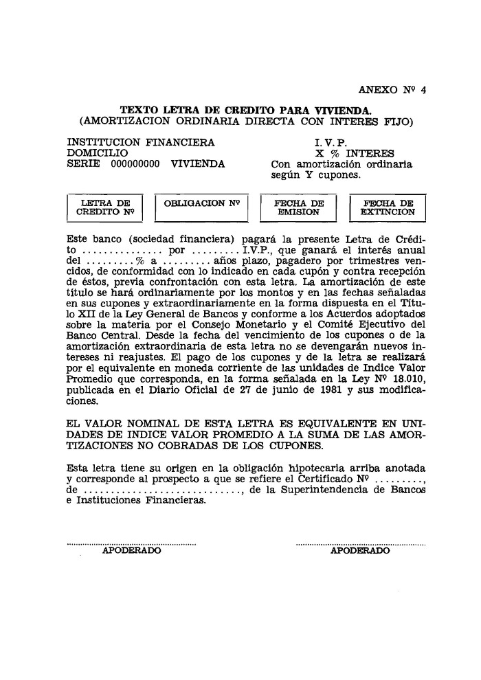 Cláusula: Entre el banco .............................................y don.................. .................................................se ha convenido en el siguiente contrato de mutuo sujeto a las disposiciones del Título XII del Decreto con Fuerza de Ley N° 252, de 4 de abril de 1960, sus modificaciones y al Acuerdo del Consejo Monetario adoptado en Sesión 23 de 6 de noviembre de 1980, publicado en el Diario Oficial de fecha 12 de noviembre de 1980 y sus modificaciones, que fijó el texto refundido de las normas sobre emisión de letras de crédito y demás normas reglamentarias pertinentes, en especial el Reglamento Financiero para la adquisición de viviendas adoptado en sesión 1437 de fecha 28 de abril de 1982 del Comité Ejecutivo del Banco Central de Chile, publicado en el Diario Oficial de 5 de mayo de 1982, y sus modificaciones.