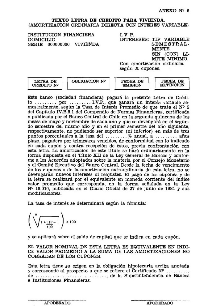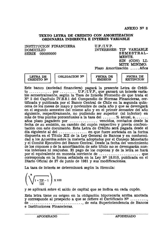Cláusula: El Banco ...............................................................a fin de enterar la parte del precio referido en la letra b) de la cláusula anteprecedente, da en préstamo a don .......................................................................... la cantidad de............................U.F. en letras de crédito nominales e iniciales, reducidas al día 1° del mes subsiguiente a la fecha del presente contrato a..........U.F. emitidas materialmente por el propio banco el día 1° del mes en que se firma esta escritura, de emisión nominal 1° de enero del presente año, de la Serie .............. con una amortización directa trimestral en el plazo de........... años, que ganan intereses variables semestralmente, pagaderos por trimestre vencido, los que se calcularán a la Tasa de Interés Promedio (TIP) de que trata el N° 5 del Capítulo IV.B.8.1 del Compendio de Normas Financieras, certificada y publicada por el Banco Central de Chile en la segunda quincena de los meses de mayo y noviembre de cada año, y se aplicará en el segundo semestre del mismo año y en el primer semestre del año siguiente, respectivamente. En todo caso, la tasa de interés que se aplique no podrá variar, durante la vigencia de las letras de crédito, en más de tres puntos porcentuales respecto a la tasa de interés del.......% anual, vigente el día 1° del mes subsi guiente a la fecha del presente contrato. (En caso que la institución financiera opte por prescindir del límite inferior de variación de la tasa de interés, deberá señalar expresamente esa decisión). La obligación rige desde el día 1° del mes subsiguiente a la fecha de este contrato, declarando el deudor haber recibido las letras de crédito a su entera satisfacción y facultando al banco para que las entregue al vendedor.