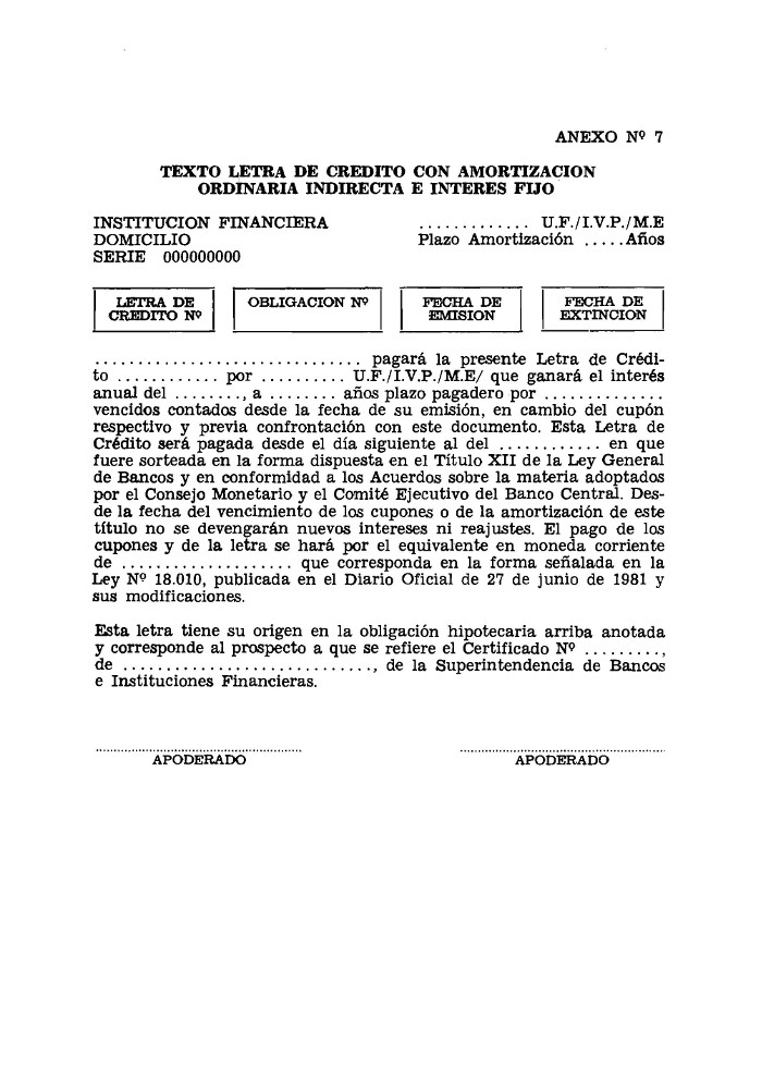 b) Con $................valor que las partes de común acuerdo asignan a las letras de crédito de la Serie......de emisión nominal 1° de enero del presente año, por.........Unidades de Fomento, nominales e iniciales, que quedarán reducidas al día 1° del mes subsiguiente a la fecha del presente contrato a......................Unidades de Fomento, que el Banco entrega al vendedor con cargo al préstamo que le otorga al comprador en la cláusula ............ de esta escritura. La reducción antes referida se produce en virtud de laaplicación de las normas contenidas en el párrafo V del Reglamento Financiero para la adquisición de viviendas a que se refiere la cláusula siguiente.