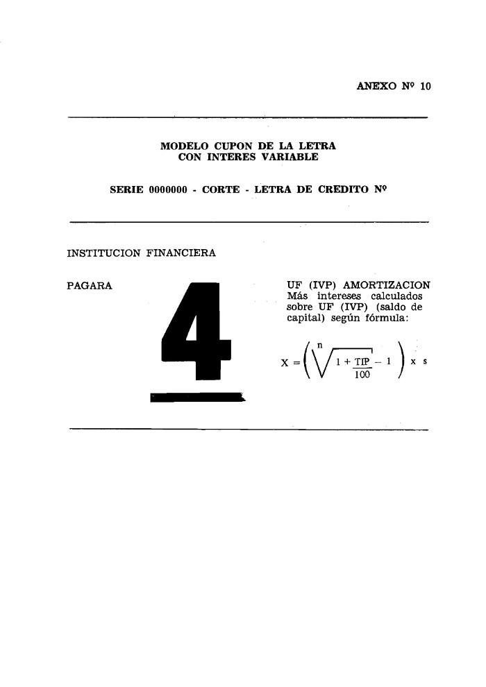 Las letras de crédito que el Banco conforme a lo estipulado en este instrumento entrega al vendedor, se encuentran con el (o los) cupón (es) correspondiente (s) desprendido (s) de acuerdo a las normas del Reglamento Financiero varias veces citado y el Banco se obliga a pagar a quien corresponda la parte de amortización ascendente a..........U.F. más el interés que se devengue a contar del día 1° del mes subsiguiente al del presente contrato y hasta el día del vencimiento del referido cupón, obligación que el Banco documenta mediante pagaré expresado en Unidades de Fomento por el monto de la amortización indicado, al que se le agregarán los respectivos intereses, con el mismo vencimiento del cupón correspondiente, de acuerdo a lo dispuesto en la letra c) del N° 5 título V del Reglamento Financiero para la adquisición de viviendas. El pago se efectuará siempre y cuando las letras de crédito que se otorgan en mutuo al comprador, se encuentren debidamente registradas, conforme a las normas vigentes. Si al vencimiento del cupón respectivo no se hubiere practicado el registro, el pago se efectuará una vez registradas las letras de crédito.