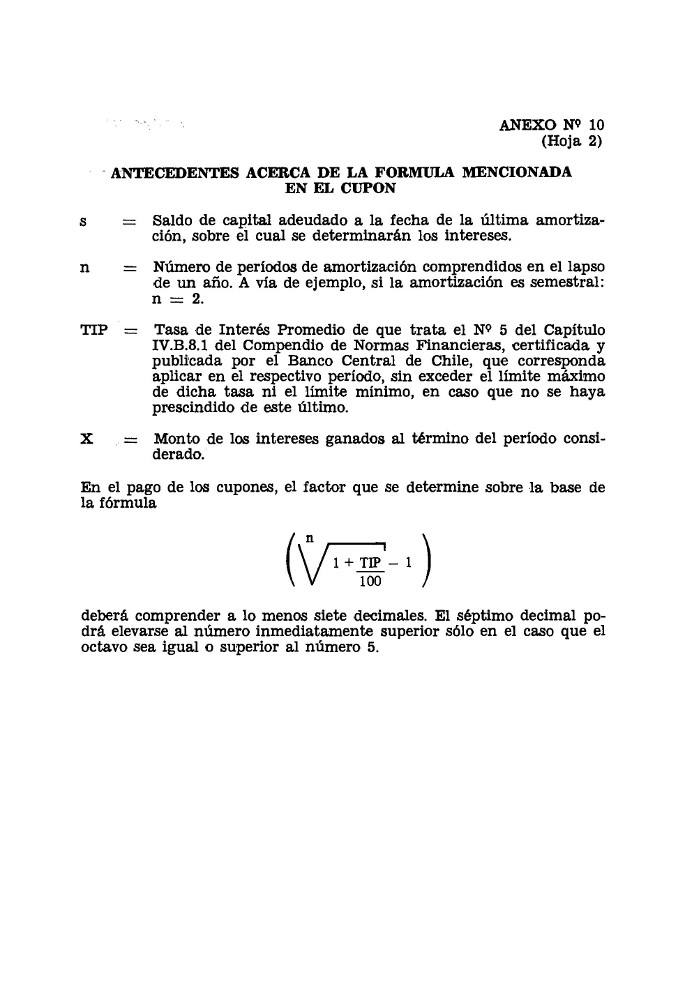 Cuando la tabla corresponda a mutuos con tasa de interés flotante, no se mencionarán los datos señalados en las letras c) y e), ya que el servicio de la deuda dependerá de la tasa de interés que rija en cada oportunidad. En este caso, se dejará constancia, en la respectiva tabla de desarrollo, de la fórmula que se utilizará para el cálculo de los intereses y que ella se aplicará sobre el saldo insoluto de capital antes del pago del respectivo dividendo. Asimismo, se indicará que en dicha fórmula se empleará la Tasa de Interés Promedio (TIP), que el Banco Central de Chile certifique y publique en el Diario Oficial, en conformidad al Capítulo IV.B.8.1 del Compendio de Normas Financieras, debiendo señalar el límite máximo que dicha tasa podrá alcanzar, como también el mínimo, en el caso que éste se hubiera fijado.