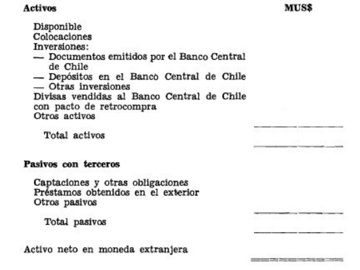 En la relación de activos y pasivos no deben considerarse los saldos de las cuentas de ajuste y control, con excepción de las divisas provenientes de recursos propios vendidos al Banco Central de Chile con pacto de recompra.