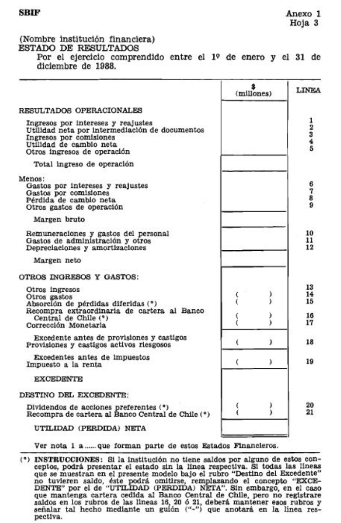 El Balance General y el Estado Resultados se presentarán según los formatos que se muestran en el Anexo N° 1 de esta circular. Estos modelos no constituyen formularios, sino que muestran la forma de presentación que deberán tener los estados que se publiquen o se destinen a la circulación.