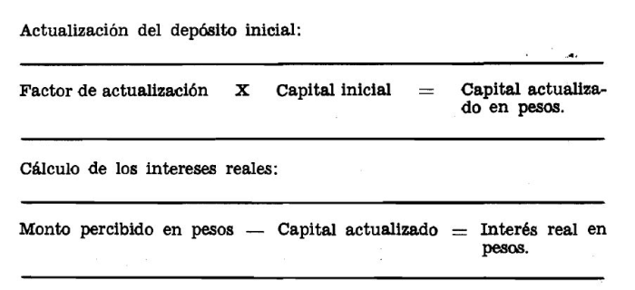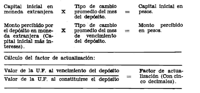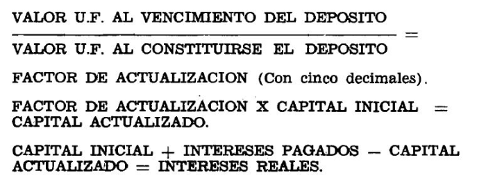 El capital inicial en moneda chilena, determinado en la forma indicada precedentemente se reajustará por la variación del valor de la unidad de fomento entre la fecha en que se efectuó el depósito y la de su vencimiento. El valor así obtenido se deducirá del equivalente en moneda chilena del monto final del depósito. La diferencia resultante, sea ésta positiva o negativa, corresponderá a los intereses reales del respectivo depósito.